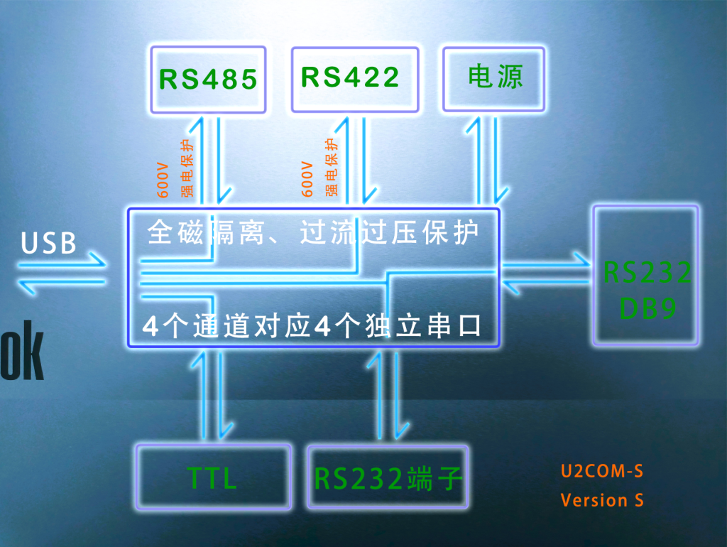 一个转换器,可以囊括RS232(DB9+端子接口)、RS485、RS422、TTL、外供电源,串口的所有协议一个转换器就都包括了。